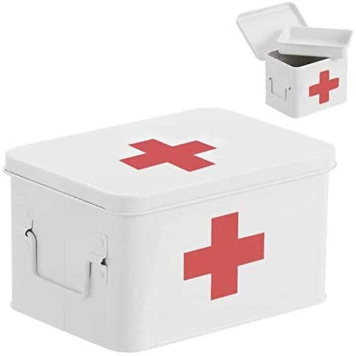 • Bandeja extraíble superior para guardar tijeras, pinzas, termómetros, bastoncillos de algodón Compartimentos separados en la parte inferior diseñados para guardar artículos pequeños como vendas, alcohol, cintas adhesivas, medicinas, píldoras, bastoncillos de algodón e yodo.
