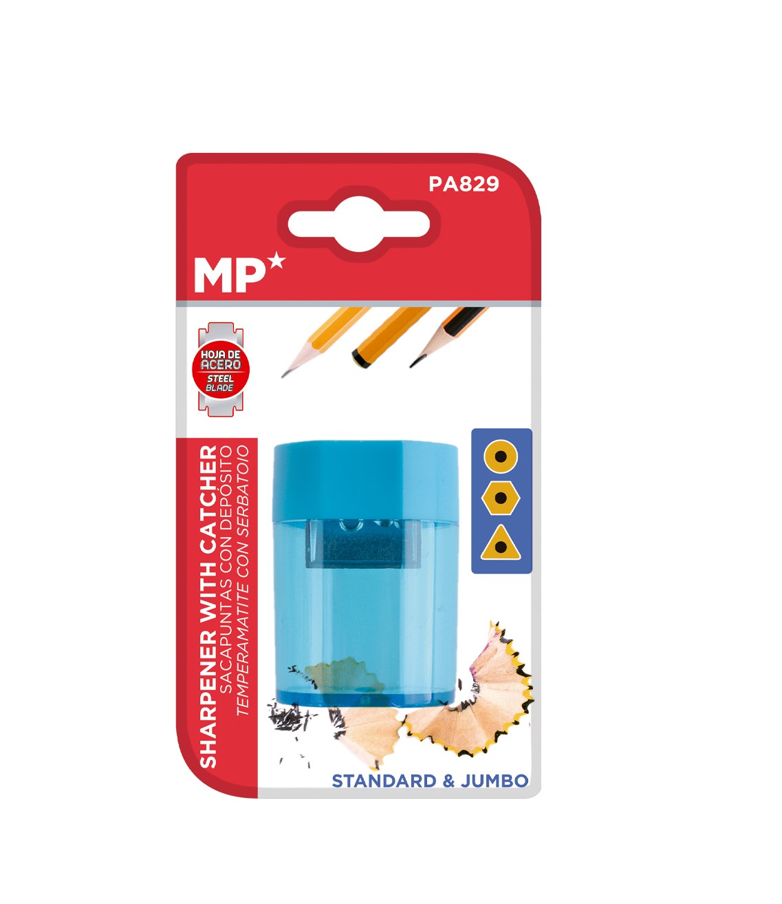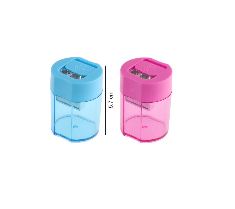 Sacapuntas doble hecho de plástico con hoja de acero. Con tapa deslizante y espacio de depósito semitransparente para poder ver cuando hay que vaciarlo. Agujero para lápices o ceras de tamaño estándar y jumbo.
