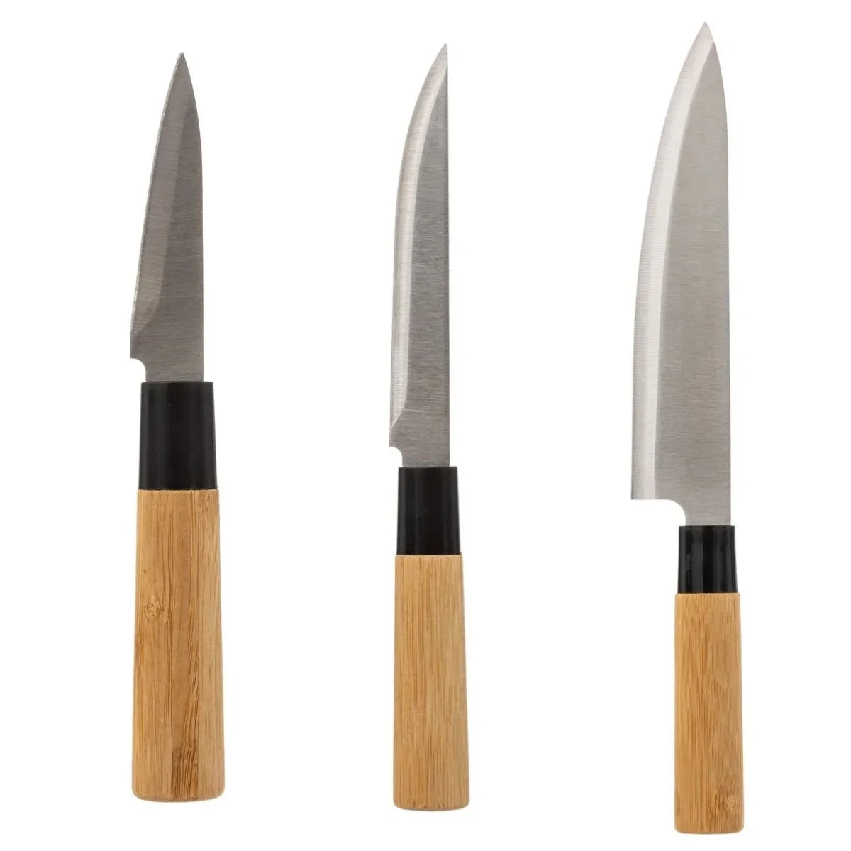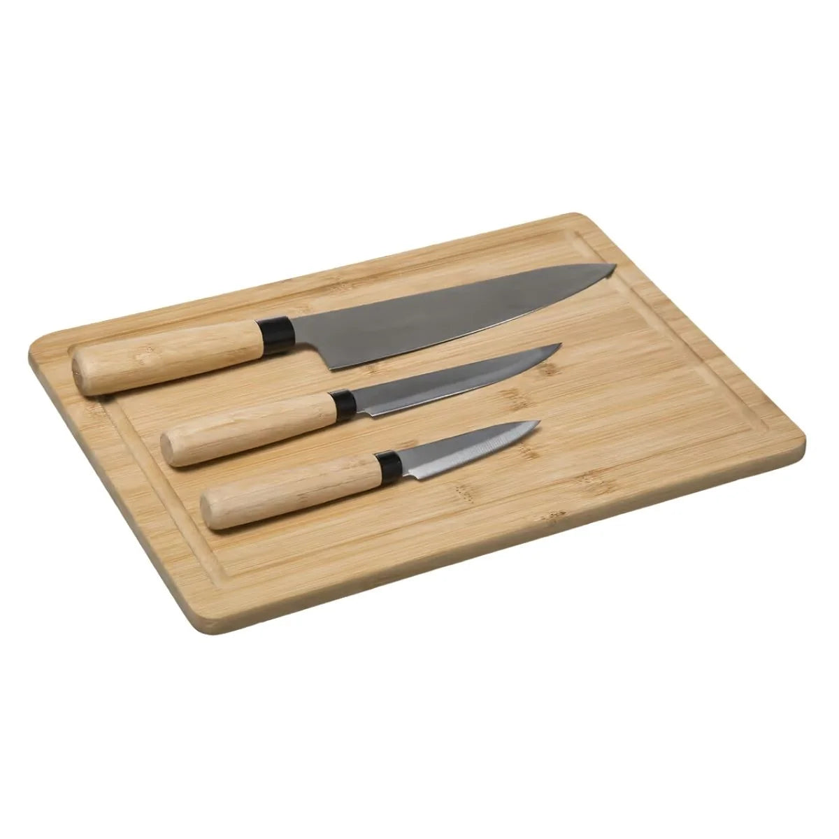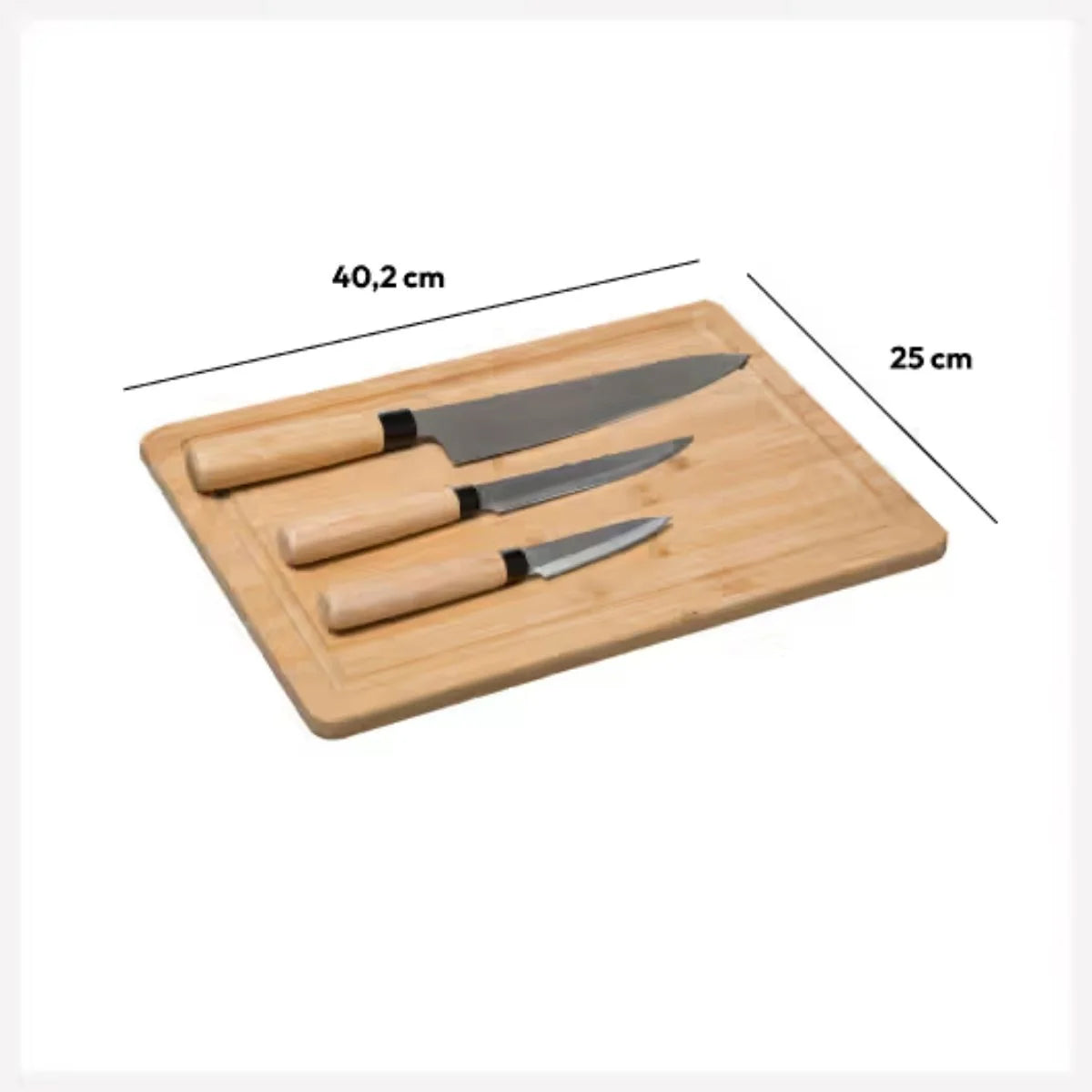 Set 4 Piezas: Tabla de Cortar de Bambú y 3 Cuchillos de Acero Inoxidable