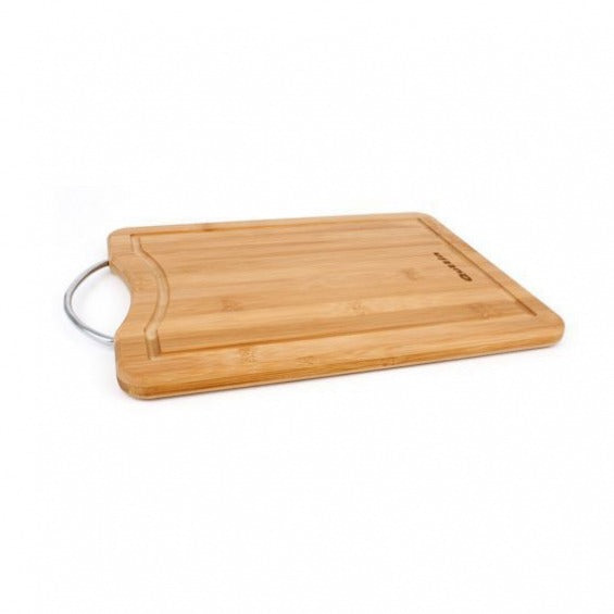 Tabla de corte fabricada en bambú. Dispone de una asa metálica.