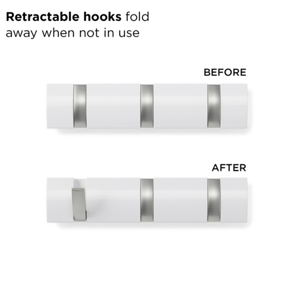 • Diseño moderno que ahorra espacio: a diferencia de los percheros tradicionales que ocupan un espacio valioso en el piso, Flip (r) es una solución montada en la pared que es ideal para espacios habitables pequeños o entradas reducidas gracias a su perfil elegante y aerodinámico y ganchos retráctiles que se guardan cuando no está en uso
