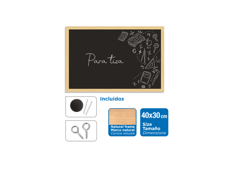 Pizarra negra diseñada para escribir con tiza. Con el marco de madera natural. Incluye tornillos para ponerlo en la pared.