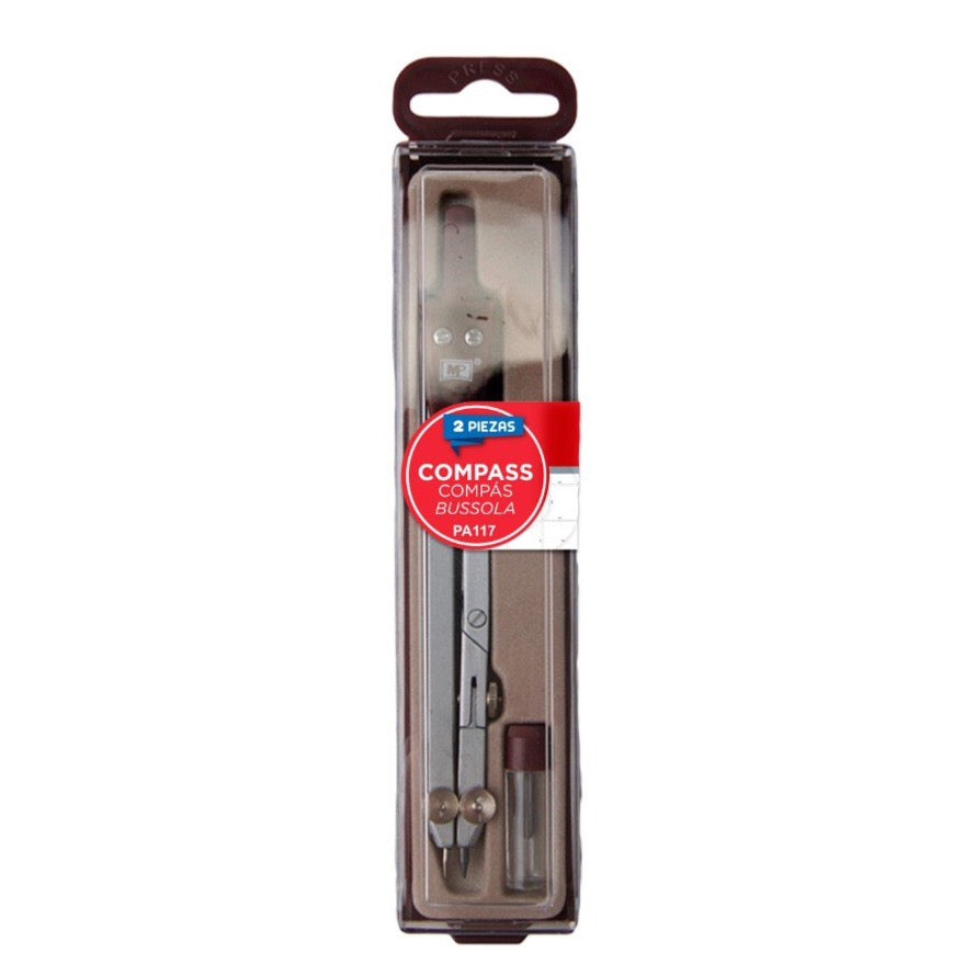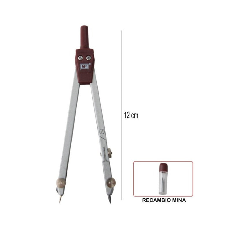 Compás básico 2 piezas de color marrón con estuche para poder guardarlo. Incluye minas de recambio. Para dibujo, diseño técnico o uso escolar.