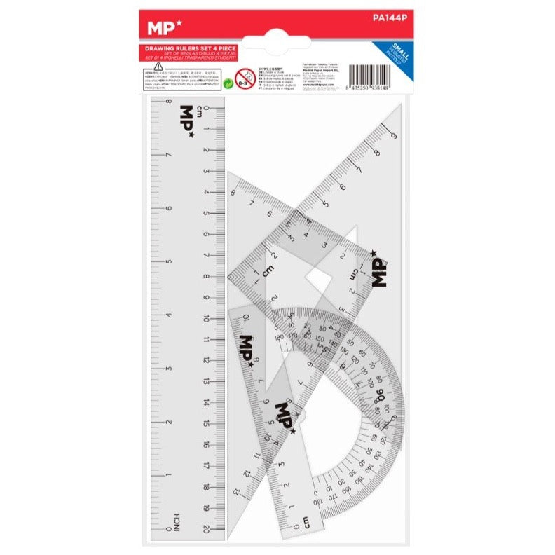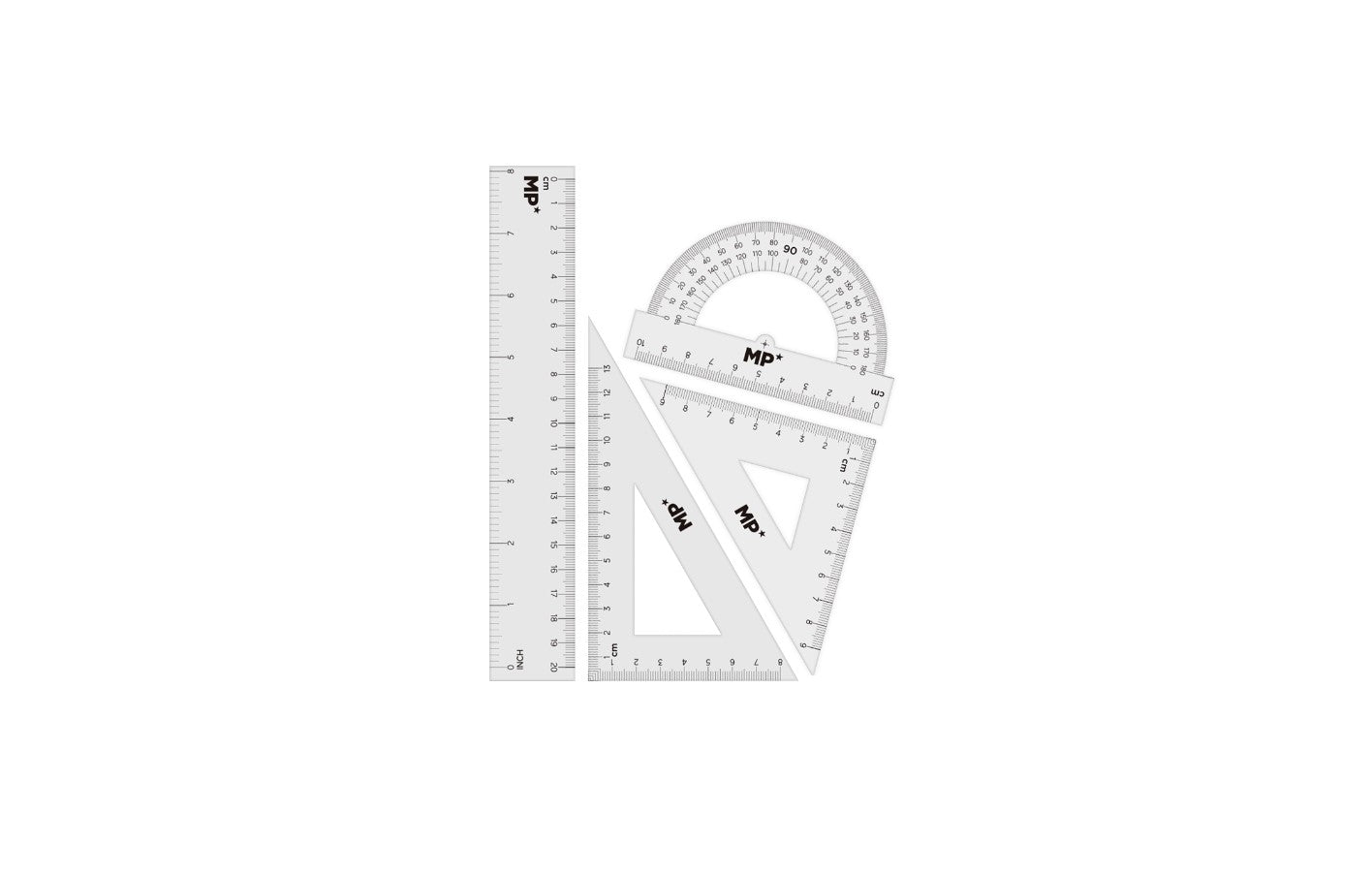 Este kit de reglas grandes de plástico incluye una regla de 30 cm, una escuadra, un cartabón y un transportador. Adecuadas para dibujo técnico y otros usos escolares.
