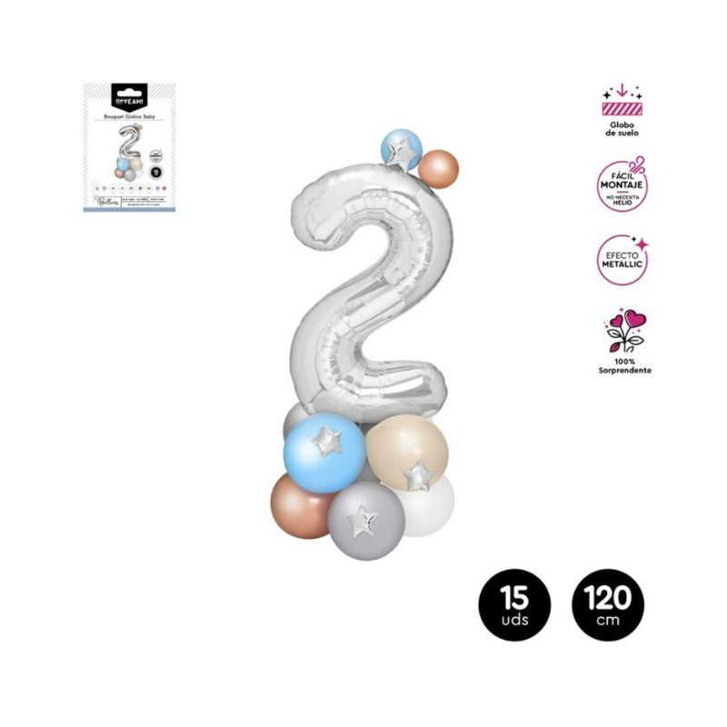 Set globos en forma del número 2 de color plateado y azul