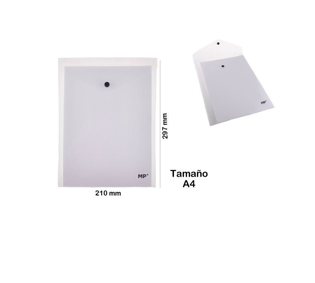 Sobre de plástico transparente con cierre de botón. Disposición vertical. Para guardar papeles de tamaño estándar de manera segura. Evite que se le arruguen las hojas o que se ensucien.
