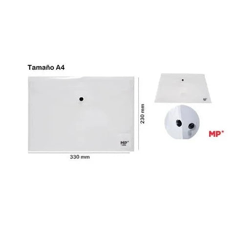 Sobre de plástico transparente con cierre de botón. Para guardar papeles de tamaño estándar de manera segura. Evite que se le arruguen las hojas o que se ensucien.