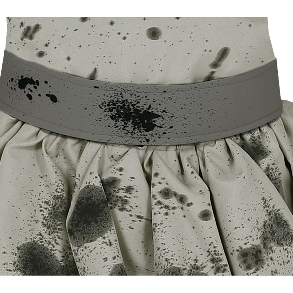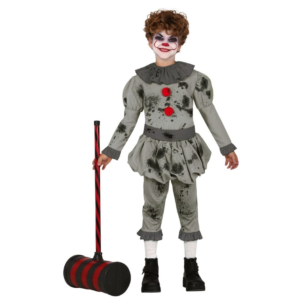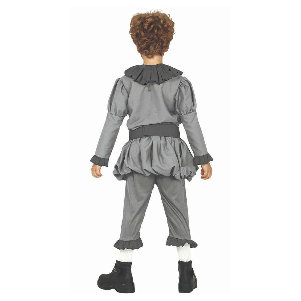 El set incluye una camiseta con cuello amplio tipo payaso, cinturón y pantalón bombacho, todo en tonos grises con salpicaduras oscuras que simulan el desgaste y el terror característico del personaje.