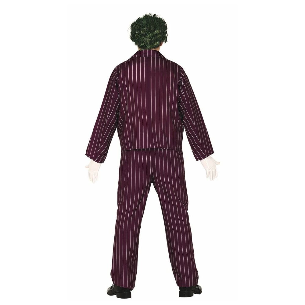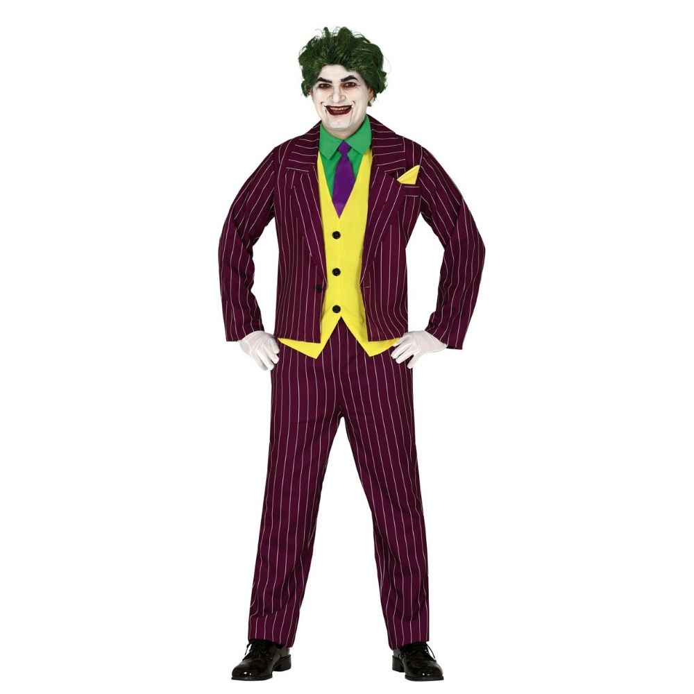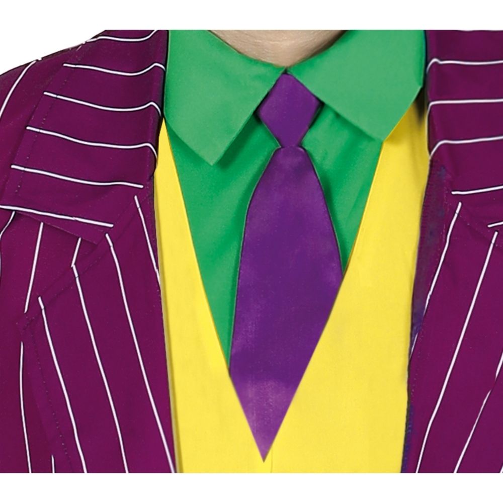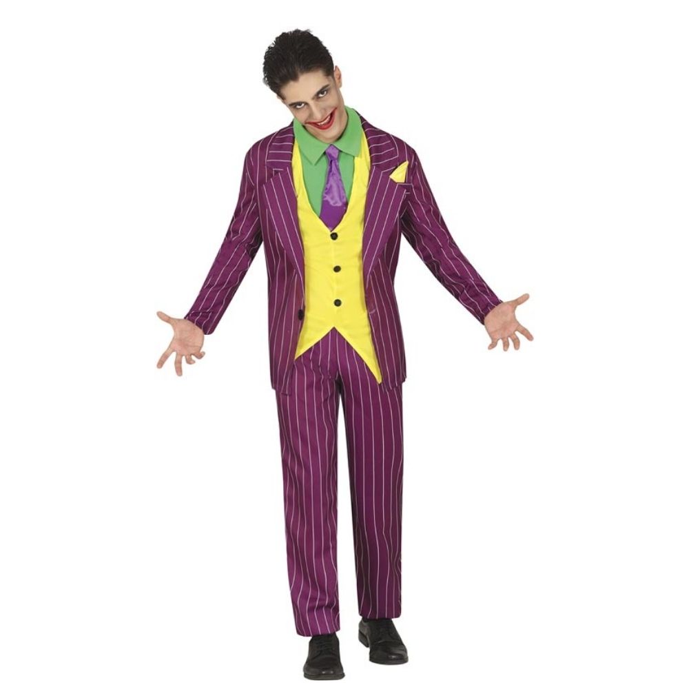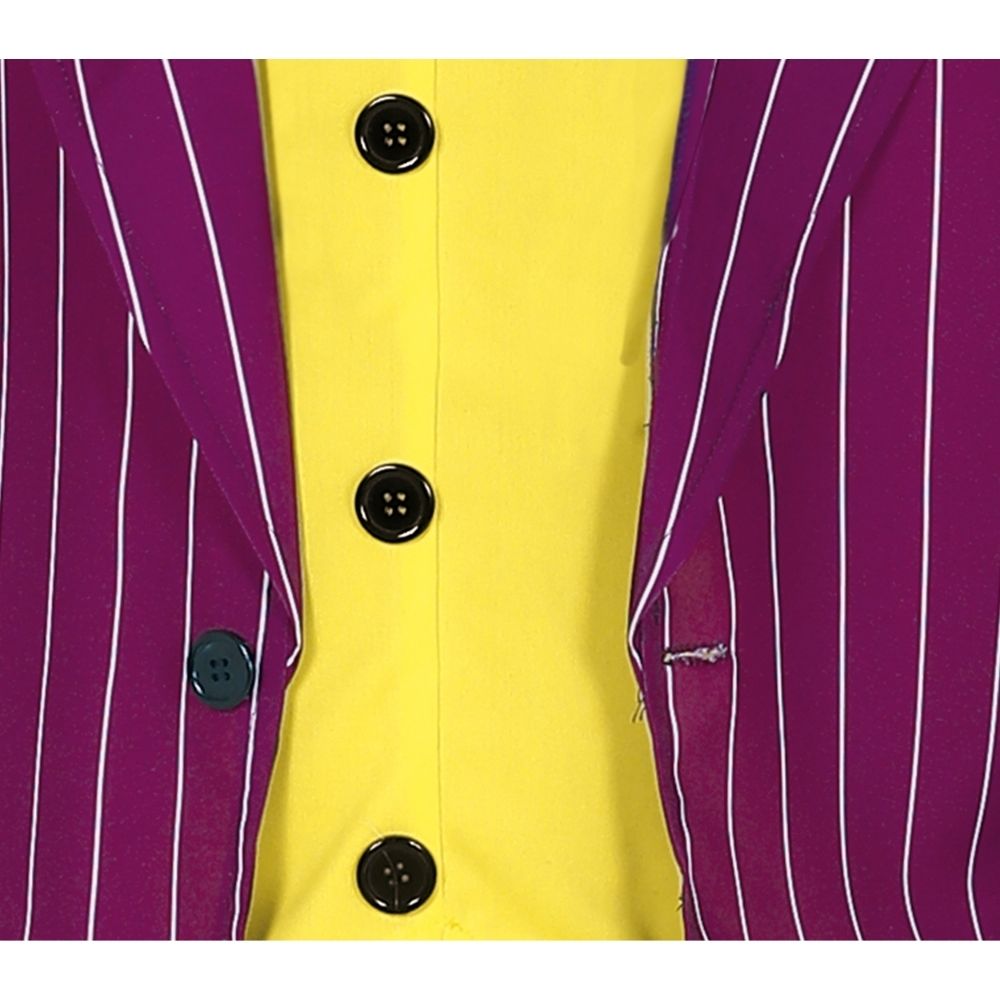 Prepárate para robar todas las miradas con este disfraz de Villano Loco para hombre, inspirado en el legendario Joker. Su diseño de rayas verticales en tonos morado y burdeos, combinado con un chaleco amarillo brillante y corbata púrpura, recrea con precisión el look más siniestro y carismático de los cómics.