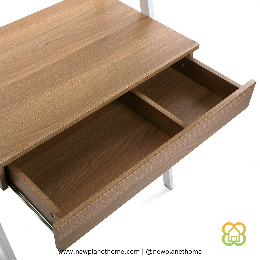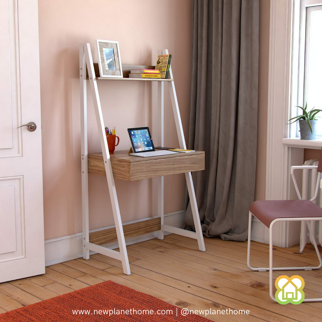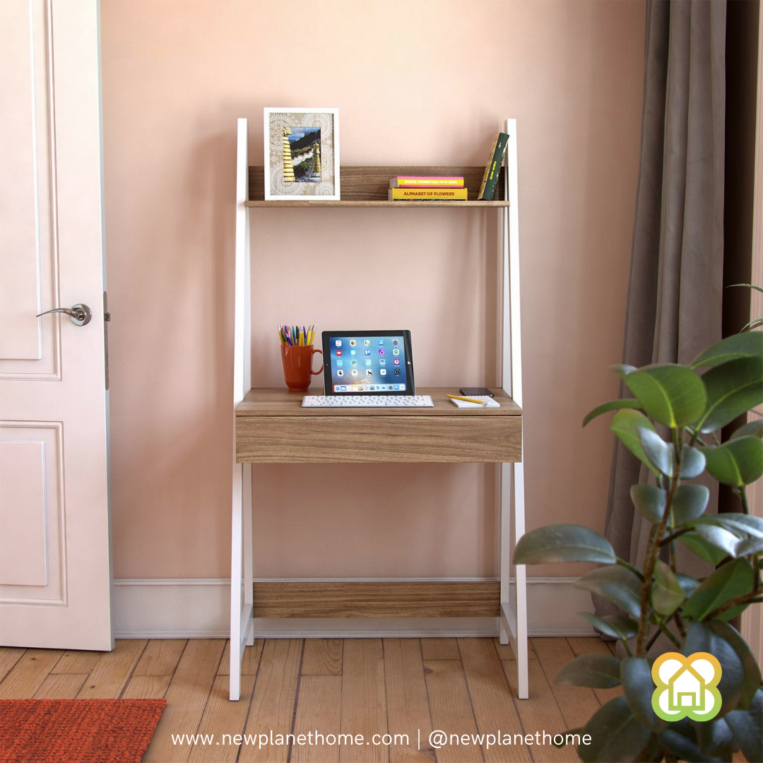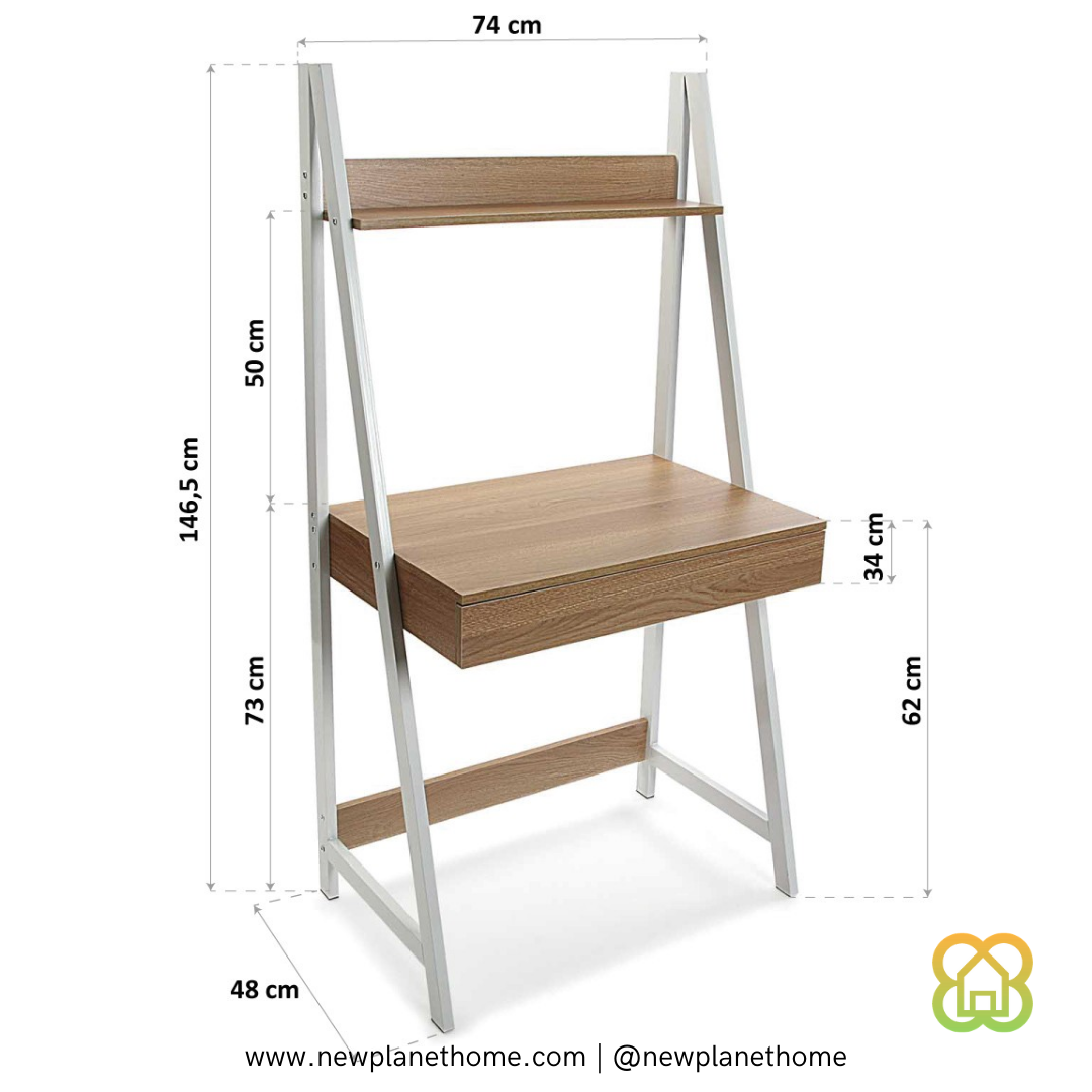 Con una estructura en forma de escalera, esta sencilla mesa de escritorio cuenta con una base triangular con un pequeño escritorio en el centro y una repisa en la parte superior. En el escritorio encontrarás, además, un cajón en el que podrás guardar todo aquello que necesites tener a mano.